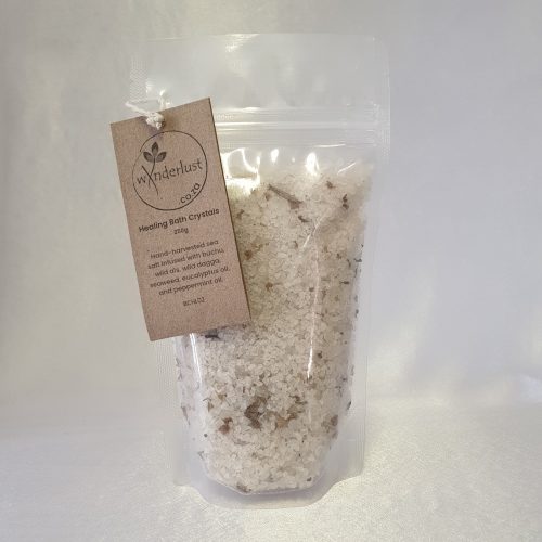 The Healing Bath Crystals in this box are your passport to relaxation and rejuvenation. Infused with eucalyptus oil and peppermint oil, these essential oils are known to relieve congestion, pain and fever. Also in these salt crystals, are a variety of healing plants – buchu, seaweed, wilde als and wilde dagga (cannabis). These healing plants disinfect the skin, reduce inflammation and are packed with antioxidants. Adding these crystals to your bathwater creates a soothing and revitalizing experience with a range of benefits, including: