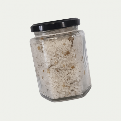 Hand-harvested Sea salt infused with eucalyptus essential oil, peppermint essential oil, buchu, wild als, wild dagga and seaweed.